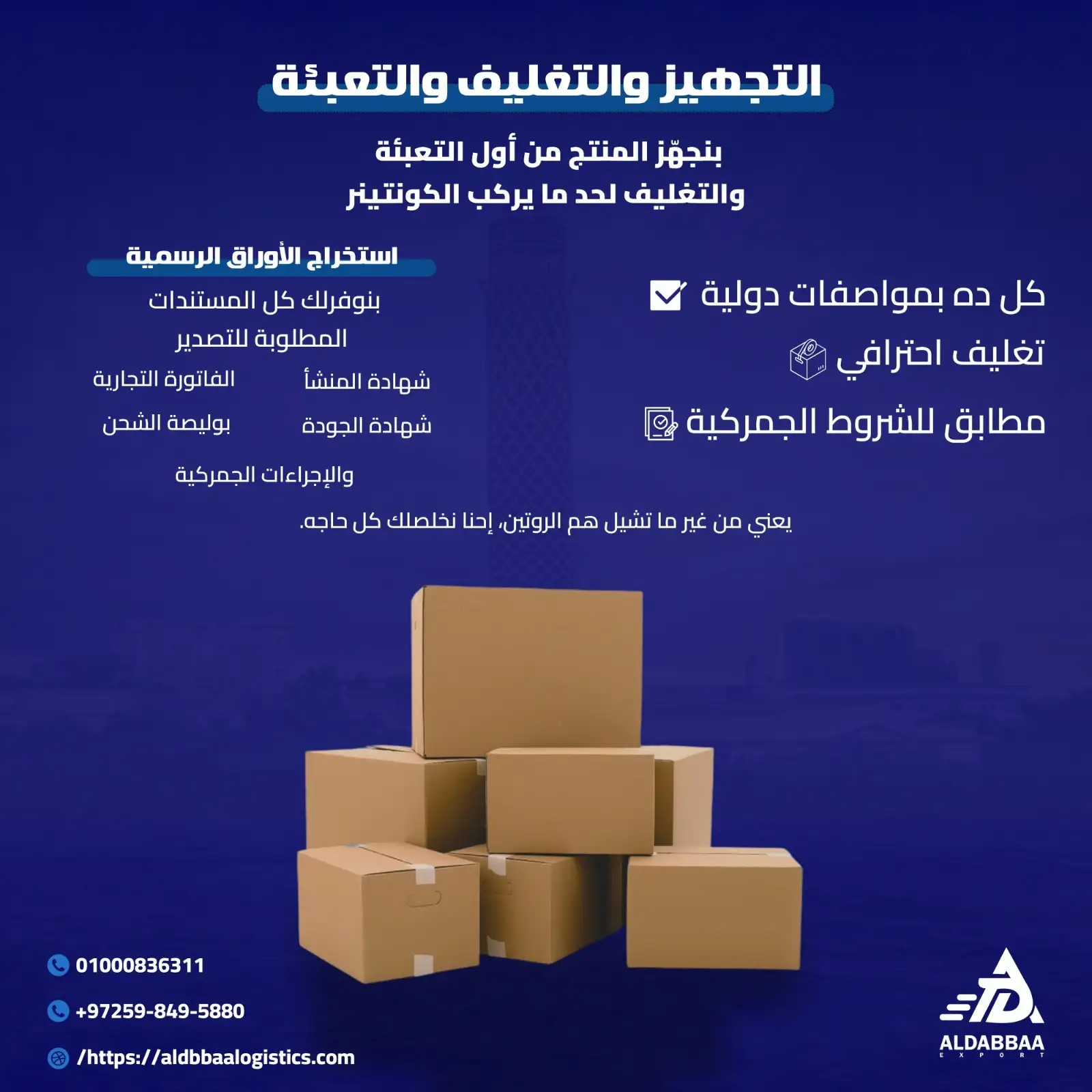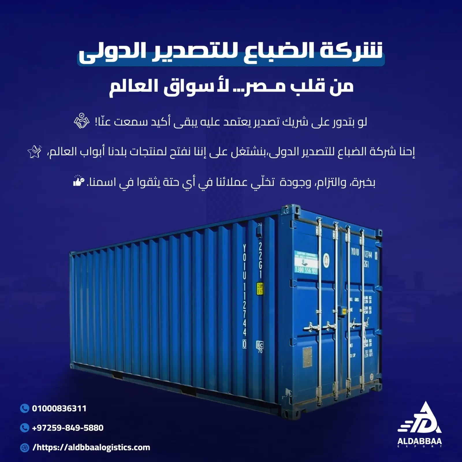 شركة الضباع للتصدير الدولي هي شركة مصرية رائدة في تقديم حلول التصدير المتكاملة، متخصصة في تصدير المنتجات المصرية إلى الأسواق العالمية. بخبرة تمتد لأكثر من 10 عامًا، نعمل على فتح أبواب التجارة الدولية أمام المنتج المحلي، مع تقديم خدمات شاملة تشمل التعبئة والتغليف، استخراج المستندات، الشحن، التخليص الجمركي، والدعم الكامل للمصدرين الجدد.